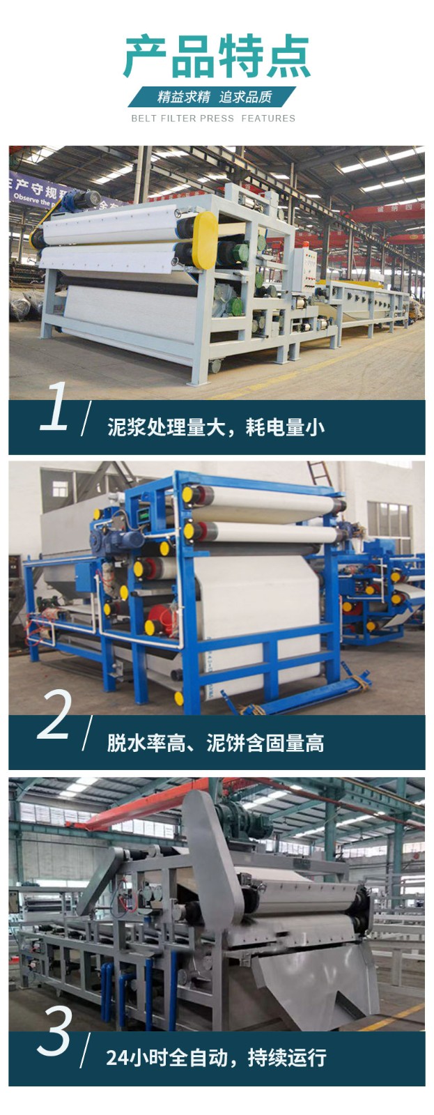 污泥脫水壓濾機(jī)設(shè)備采用的技術(shù),外形美觀大方。結(jié)構(gòu)剛度大,運(yùn)行平穩(wěn),噪音低。可配置的濃縮預(yù)處理設(shè)備,對(duì)污泥絮凝效果好,運(yùn)行成本低。重力脫水區(qū)配備的布料器,使物料分布均勻,延長(zhǎng)濾帶壽命。具有超常的重力脫水區(qū)和楔型脫水區(qū),物料脫水充分,保證物料不會(huì)在壓榨區(qū)溢出。輥軸系排列科學(xué)有序,重力脫水、楔型脫水、壓榨脫水分別排出,互不干擾。壓榨脫水輥直徑比率大,脫水效果好,因此生產(chǎn)能力大,節(jié)能效率高。從進(jìn)料到排出泥餅連續(xù)作業(yè),自動(dòng)化程度高,根據(jù)需要可設(shè)PLC接口,便于微機(jī)集中控制。動(dòng)力傳動(dòng)機(jī)構(gòu)采用機(jī)械或變頻無級(jí)調(diào)速,調(diào)速范圍大,適應(yīng)性廣。設(shè)有可靠的反沖洗裝置,保證濾帶的脫水效果。采用氣動(dòng)張緊和氣動(dòng)自動(dòng)糾偏裝置,保護(hù)濾帶的正常運(yùn)行。操作穩(wěn)定可靠,采用紅外穩(wěn)定防護(hù)和整體的緊急停車裝置??筛鶕?jù)不同物料配置不同規(guī)格型號(hào)的濾帶,過濾精度高。可根據(jù)進(jìn)料濃度不同選裝轉(zhuǎn)鼓濃縮機(jī)和帶式濃縮機(jī)。